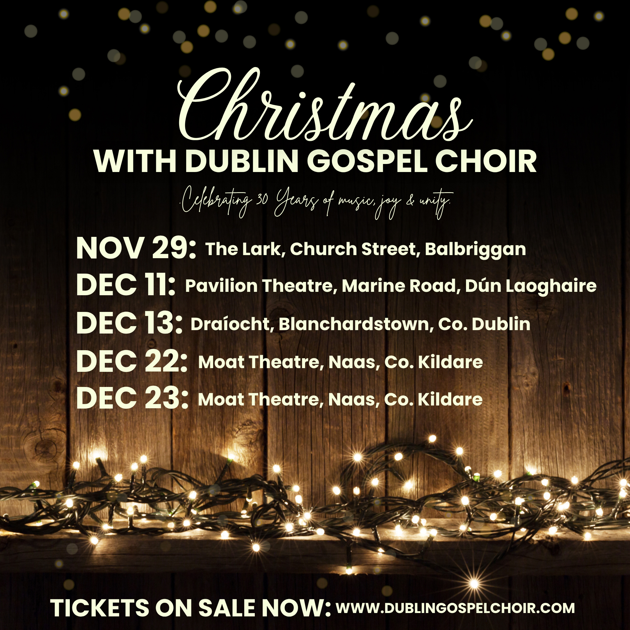 We’re celebrating 30 years of joy, soul, and unforgettable harmonies! Dublin Gospel Choir is taking our Anniversary Tour across Ireland. Join us as we honor three decades of spreading love through music. Tickets available now – come celebrate with us! More dates coming soon.